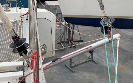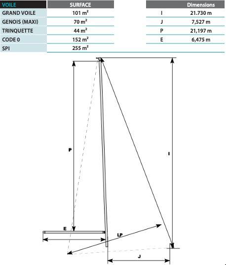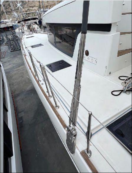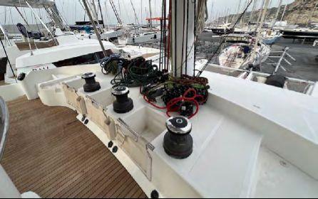 Sail plan includes a 101 sqm fully battened mainsail, 70 sqm self-tacking genoa and a 152 sqm Code 0 on electric furler (2022). All maneuvers are centralized to the flybridge with 5 electric winches, allowing safe short-handed sailing.