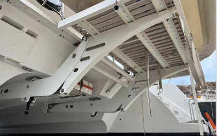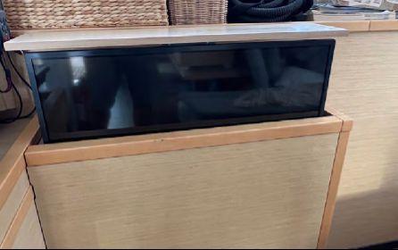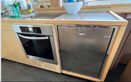 The panoramic saloon is bright and welcoming, featuring a retractable TV (2022), Fusion sound system (2022), integrated safe and a rare L-shaped galley with central island. Equipment includes electric oven, induction cooktop, double refrigerator (one added 2022), double drawer freezer (2022), Miele dishwasher, Miele washing machine, ice maker (2022), Nespresso machine and Sodastream.