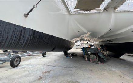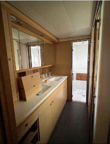 The full starboard owner’s hull features a king-size berth, desk area, generous storage, double sinks, separate shower and independent toilet. The port hull hosts two spacious guest cabins with private en-suite bathrooms and electric toilets. An additional skipper cabin is fitted forward.